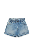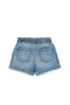 Pantaloni corti in JoggJeans®. Realizzati in denim chiaro a mano morbida, contraddistinto da sfumature, baffature e cuciture a contrasto cromatico. Piccole abrasioni sul davanti.