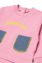 Felpa girocollo con logo e tasche applicate in denim a contrasto, perfetta per aggiungere un tocco originale al guardaroba quotidiano.