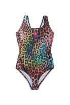 Costume intero con logo e stampa animalier multicolore sul davanti, caratterizzato da scollo arrotondato e apertura cut-out sulla schiena.