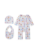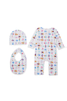 Set nascita in morbida maglia a microcostine con body, berretto e bavaglino coordinati con grafica allover Galaxy a tema robot. Il kit viene fornito all'interno di un'originale gift-box.