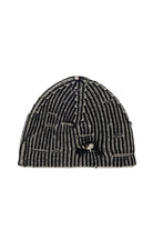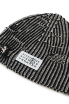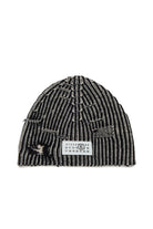Berretto beanie in lana a coste a coste bicolor, morbido e avvolgente. Le rotture rammendate conferiscono un effetto vissuto, rendendo questo accessorio un elemento perfetto per un look che unisce comfort e personalità.