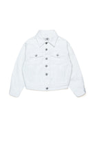 Giacca in jeans a maniche lunghe. Denim bianco dal look pulito. Logo Margiela 6 ricamato in tono sul retro. Tasche a filetto e taschini sul davanti. Chiusura anteriore con bottoni a vista. Iconica cucitura sul retro. Realizzata in 100% cotone.
