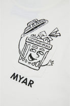 T-shirt girocollo realizzata con tessuto deadstock con taschino applicato sul lato cuore, che riprende la forma della stampa di un bidone per la raccolta differenziata. Stampa serigrafica della grafica Reuse.