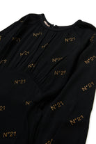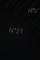 Abito corto in crêpe allover N°21 con hotfix applicati. Il tessuto fluido e le riprese donano movimento, mentre il logo si trasforma in una costellazione di punti luce, per uno stile davvero unico.