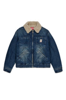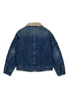 Trucker jacket in dark blue denim with a dirty effect. The teddy collar adds contrasting texture, while the label on the heart-side pocket gives a distinctive accent. A perfect garment for those who love denim with an authentic soul.