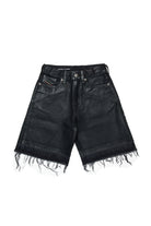 Black denim short pants with raw-cut hems. The special coating gives a special shiny effect that enhances the grunge soul of the garment.
