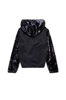 Long-sleeve hooded sweatshirt made with an original mix of mesh on the front and triacetate on the back, embellished with tone-on-tone piping. Moving sequins on the front create a special play of light and movement. Perfect for parties and special occasions.