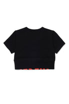 Cotton T-shirt with contrasting logo at the hem. The cropped design features short sleeves and a straight cut.