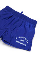 Logo boxer swim trunks. Model featuring a short design and contrasting printed lettering.