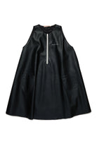 Short flared dress in Coated fabric with a strong contemporary character. Zip closure with contrasting color ribbon emphasizes the modern style. Front pockets add a functional touch. Perfect for special occasions.