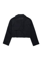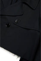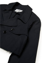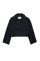 Long-sleeved twill jacket. Re-cut construction simulating the assembly of two previously unstructured garments. Front welt pockets. Double-breasted closure at the front. Raw cut hem at the bottom. Iconic seam at back. Made of 100% cotton. A garment that embodies MM6's DNA.