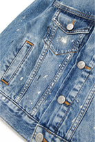 Blue denim long-sleeved jacket with color contrasting gradients. Characterised by the 'color spots' treatment carried out by hand. Button closure. Mandarin collar. Breast pockets and welt pockets on the front. Iconic seam at the back. Made of 100% cotton. Any differences between the photographed garment and the one you will receive are a symbol of the fine workmanship, quality and uniqueness of the product.