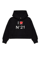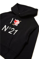 Long-sleeved hooded sweatshirt. Features an 'I Love N°21' graphic on the front with a tattoo-style heart. Front pouch pocket. Ribbed cuffs and bottom construction. Made of 100% cotton.