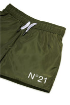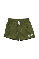 Nylon boxer swimsuit. Midi length. Drawstring waist. Contrasting color N°21 Institutional logo on front. Mesh inner briefs. Back pocket.